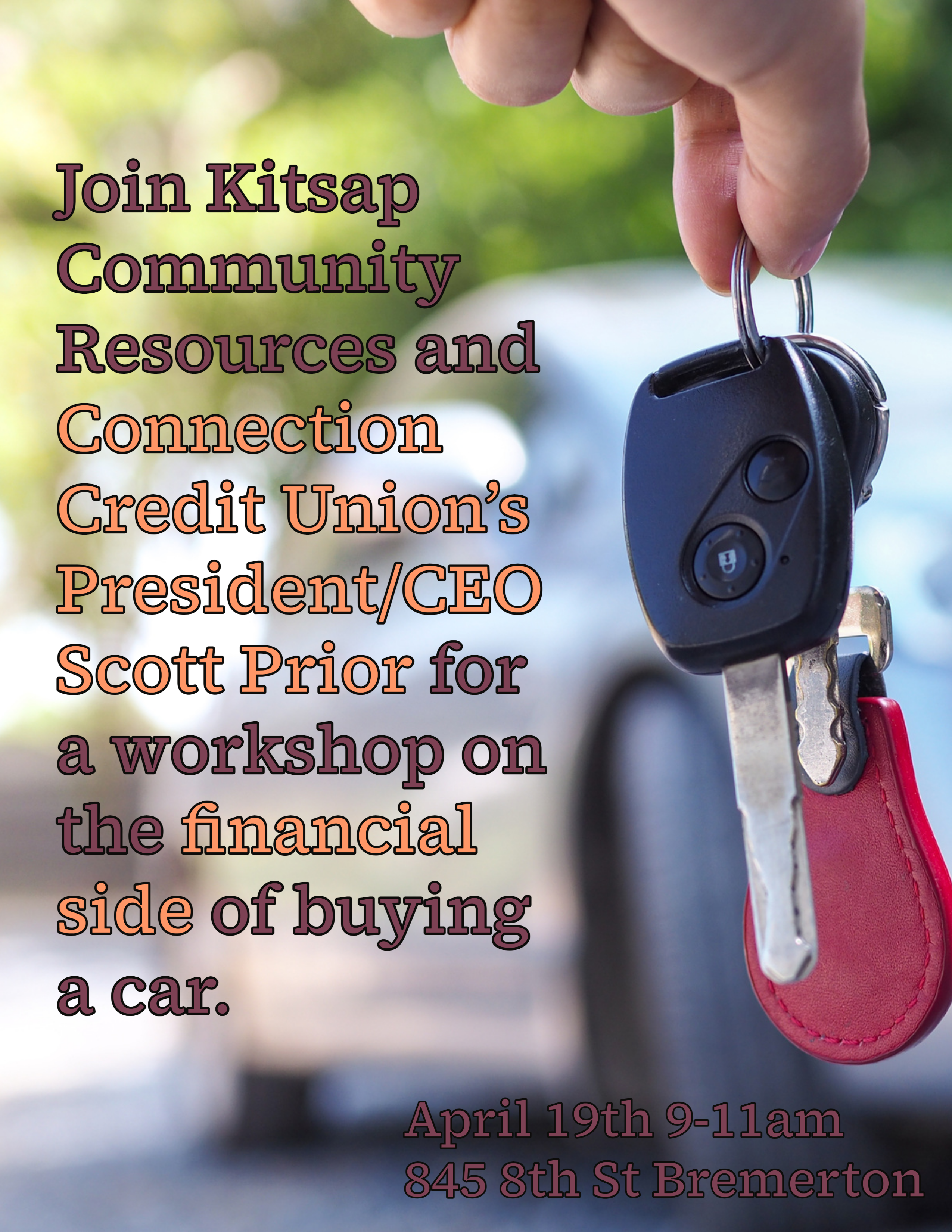 Join Kitsap Community Resources and Connection Credit Union’s President/CEO Scott Prior for a workshop on the financial side of buying a car. Scott takes professional and personal experience to give you an overview of steps and tips to make buying a car less stressful and less expensive. See actual before and after comparisons and a breakdown of the various charges both required (taxes & registration) and optional (undercoat/etching) and the influence of interest rates over the length of the loan.