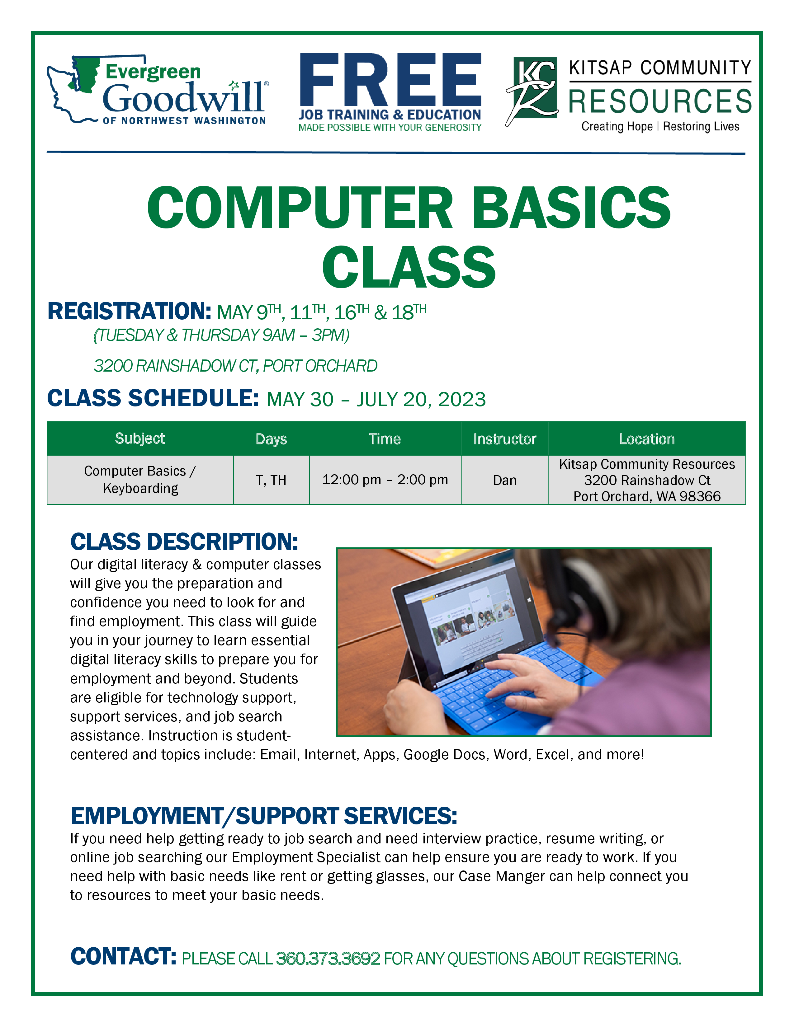 Evergreen Goodwill’s Digital Literacy & Computer classes will give you the preparation and confidence you need to look for and find employment. This class will guide you in your journey to learn essential digital literacy skills to prepare you for employment and beyond. Students are eligible for technology support, support services, and job search assistance. Instruction is student-centered and topics include Email, Internet, Apps, Google Docs, Word, Excel, and more!