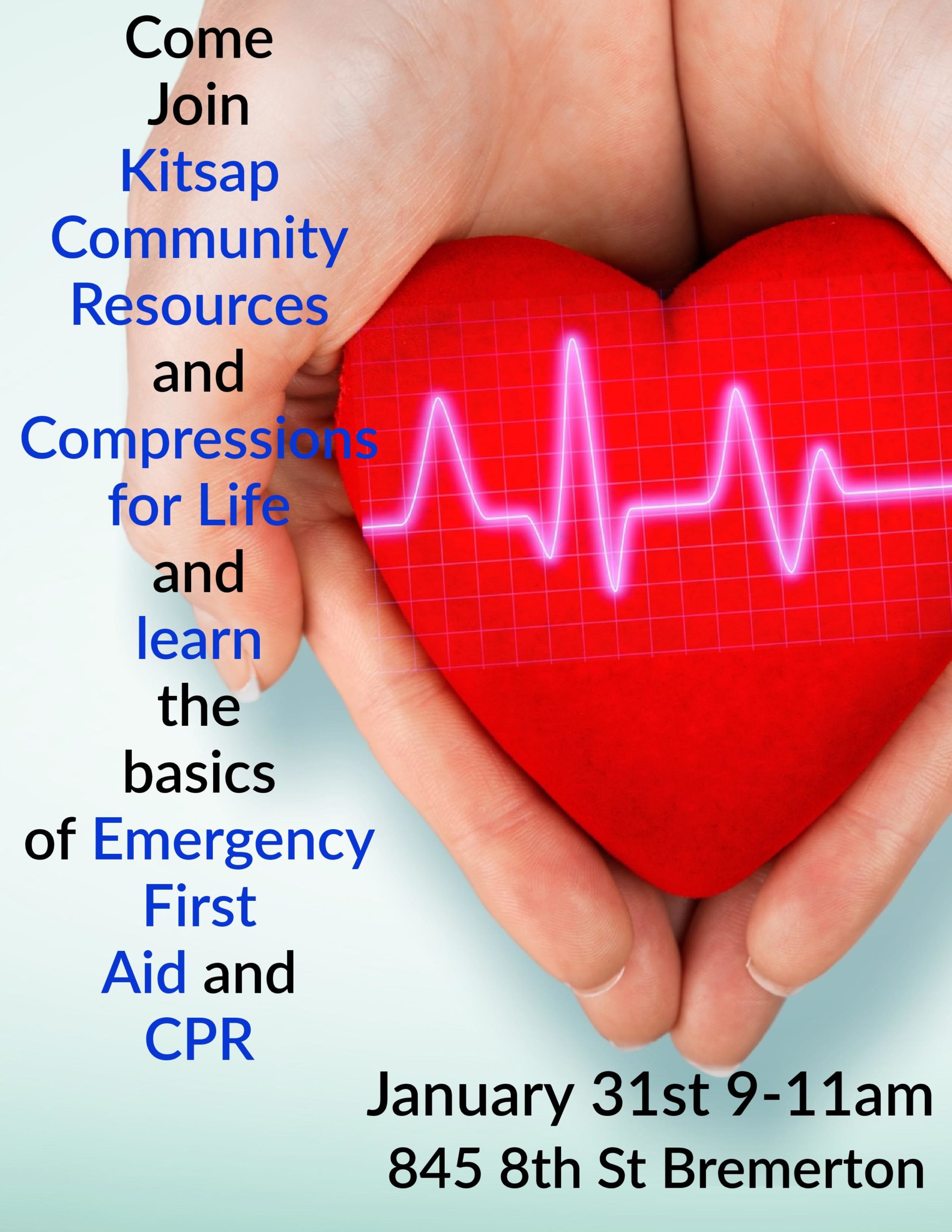 Come Join Kitsap Community Resources and Compressions for Life and learn the basics of Emergency First Aid and CPR!