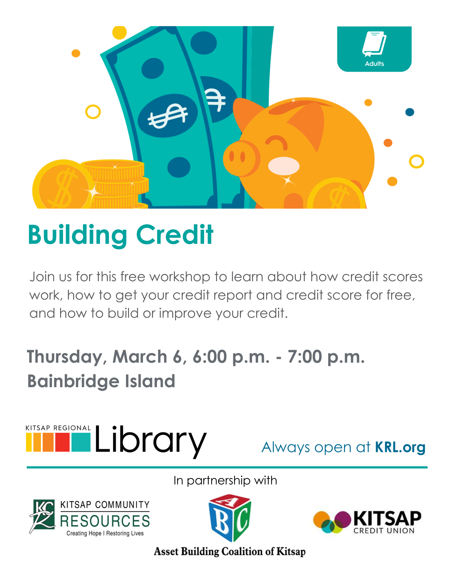 Join us on Thursday, March 6th at 6 PM at the Bainbridge Kitsap Regional Library for a class on credit reports and credit scores.  This is a free in-person class with contributions from Kitsap Community Resources and Kitsap Credit Union. Whether you are just starting to build your credit, are rebuilding, or just want to know more so you can keep your score up, tips will be provided to help you.