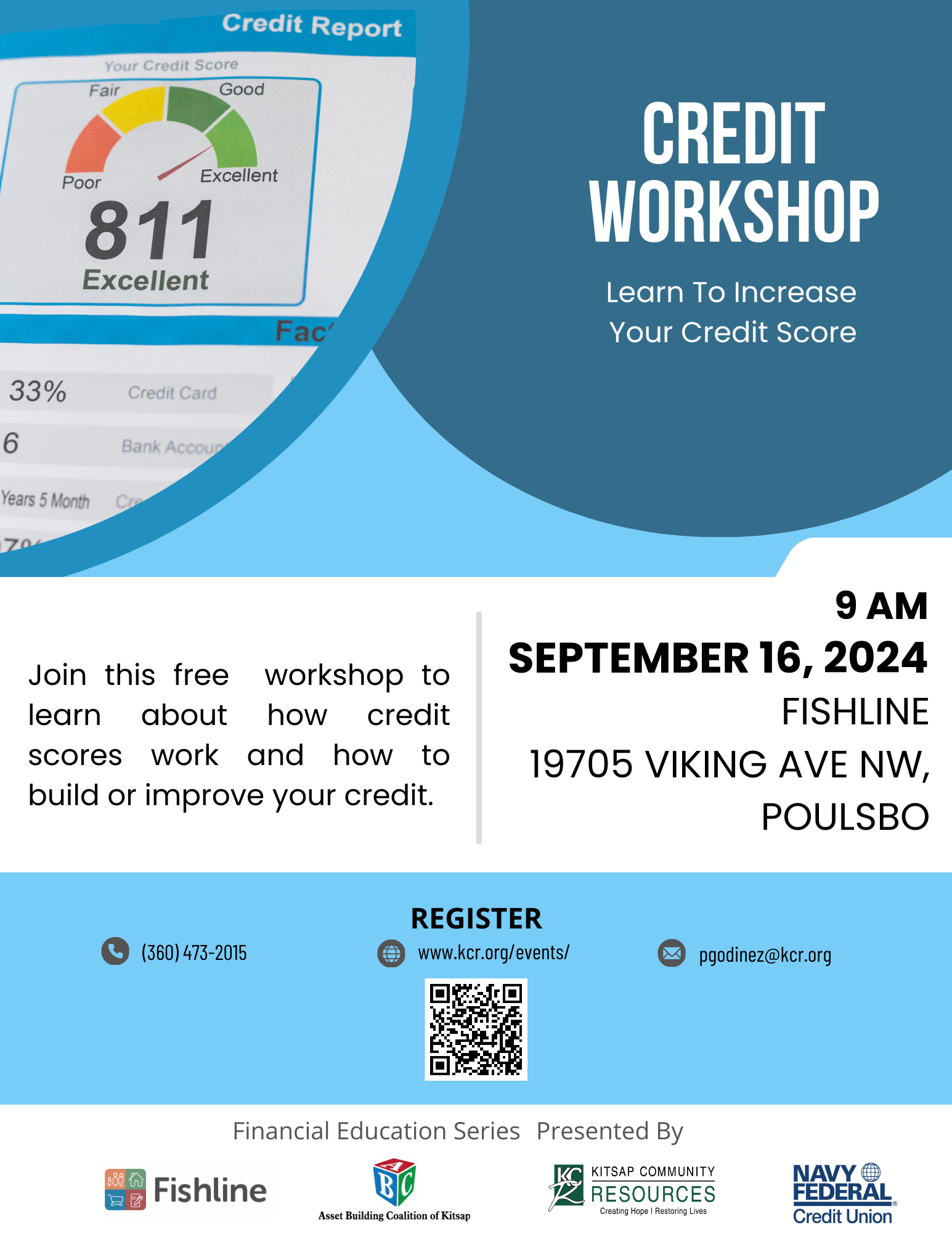 Join the Asset Building Coalition of Kitsap 9am on Monday 9/16 at Fishline in Poulsbo for our credit workshop outlining how credit scores work and how to raise your score. The workshop is free and open to the public. Preregistration appreciated but not required.