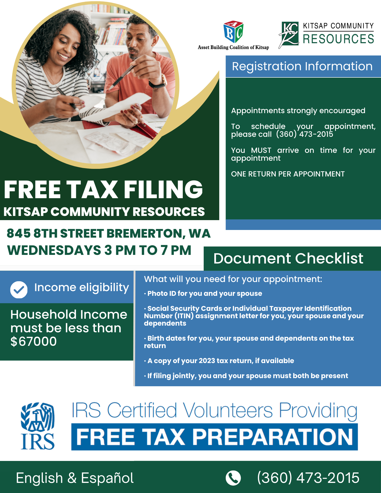 The Volunteer Income Tax Assistance (VITA) program is assisting taxpayers at Kitsap Community Resources every Wednesday through April 15th.  Please call 360-473-2015 to make an appointment.  You will need to bring your photo ID and tax identification documents.  Please refer to the flyer for the full list of documents you’ll need.  This program aims to serve household incomes less than $67,000 but feel free to call if you have questions about whether your tax situation is in scope.