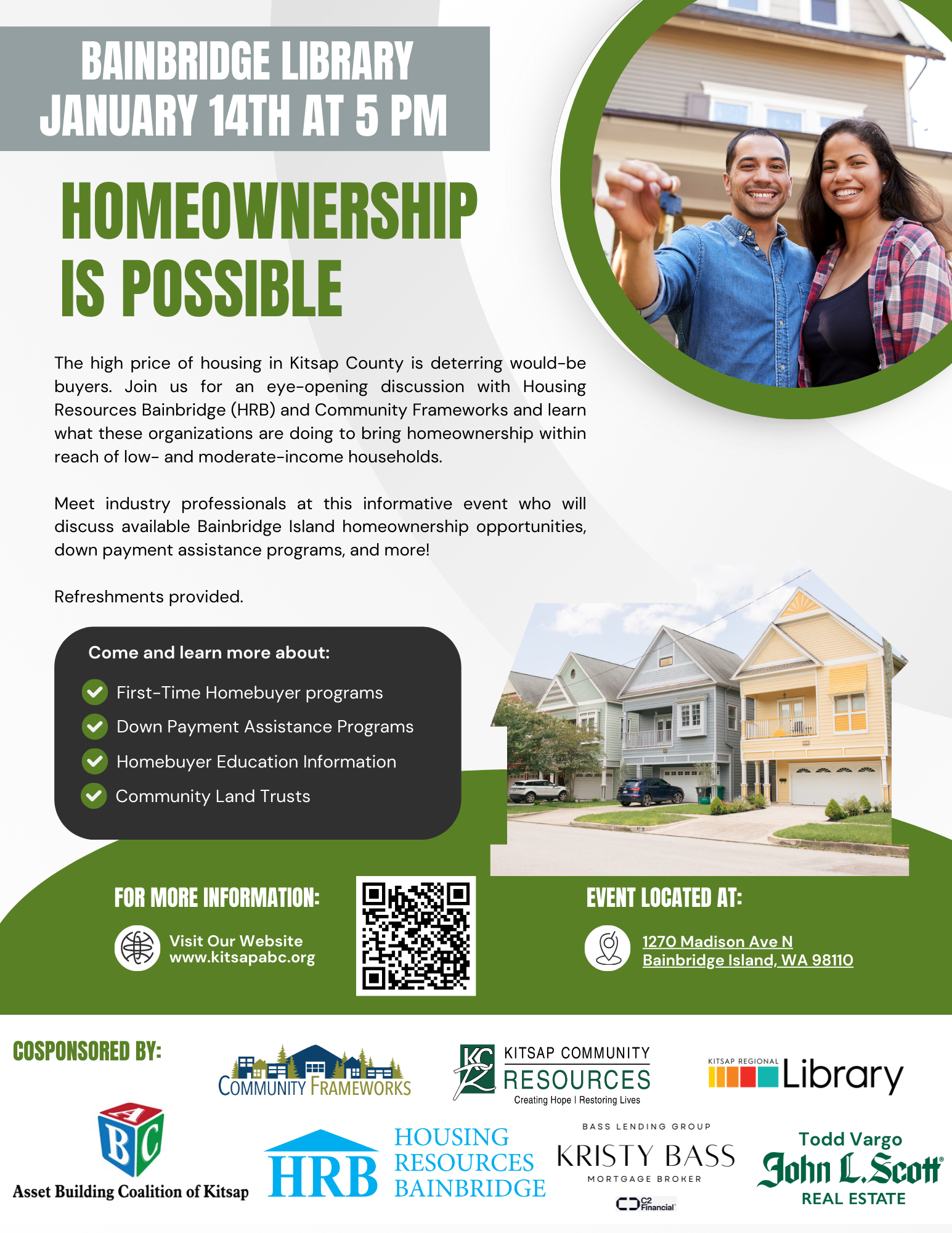 Meet industry professionals at this informative event who will discuss available Bainbridge Island homeownership opportunities, down payment assistance programs, and more!