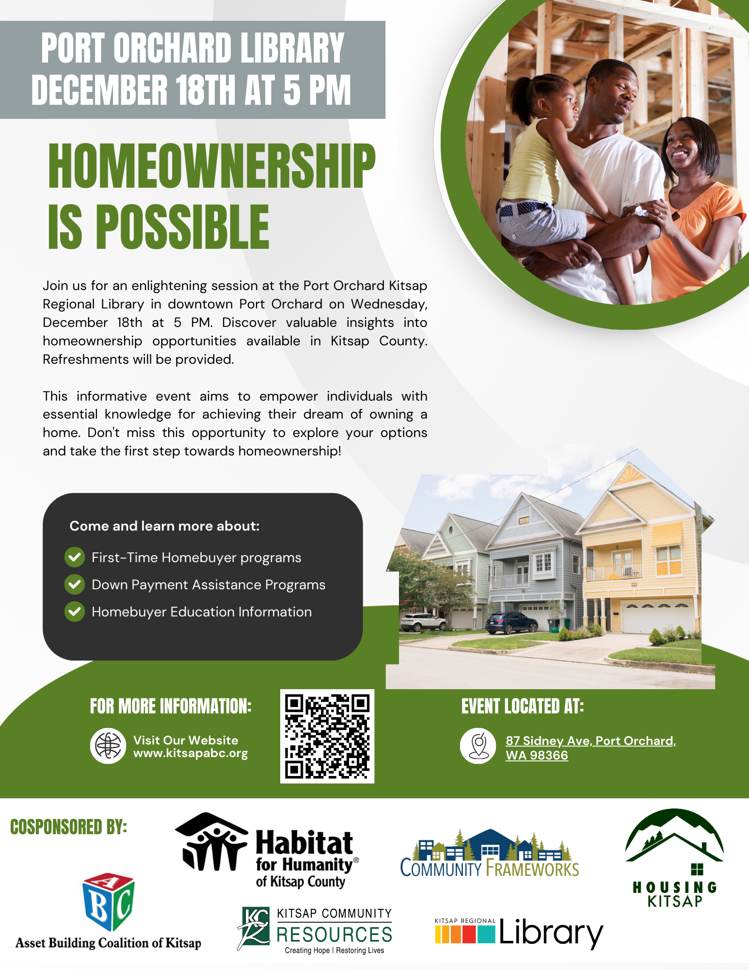 Join us to learn about homeownership opportunities available in Kitsap County at the Port Orchard Kitsap Regional Library on Wednesday December 18th at 5 PM. Presenters will include Community Frameworks, Habitat for Humanity, and Housing Kitsap. Refreshments will be provided.