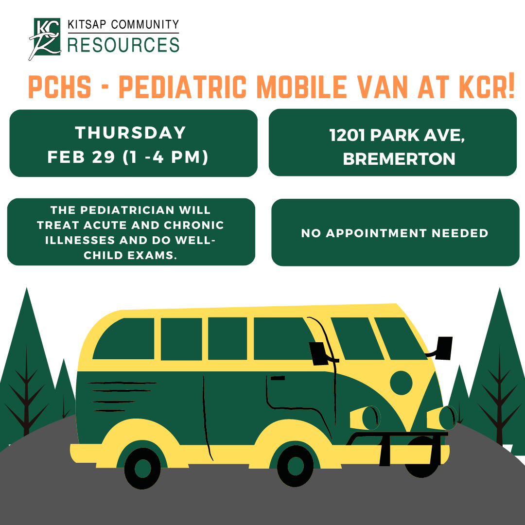 1201 Park Ave, Bremerton 1201 Park Ave, BremertonOn Feb. 29th (THURSDAY) the PCHS Pediatric Mobile Medical van will be at KCR Head Start (1201 Park Ave) from 1 to 4 pm. The pediatrician will treat acute and chronic […]