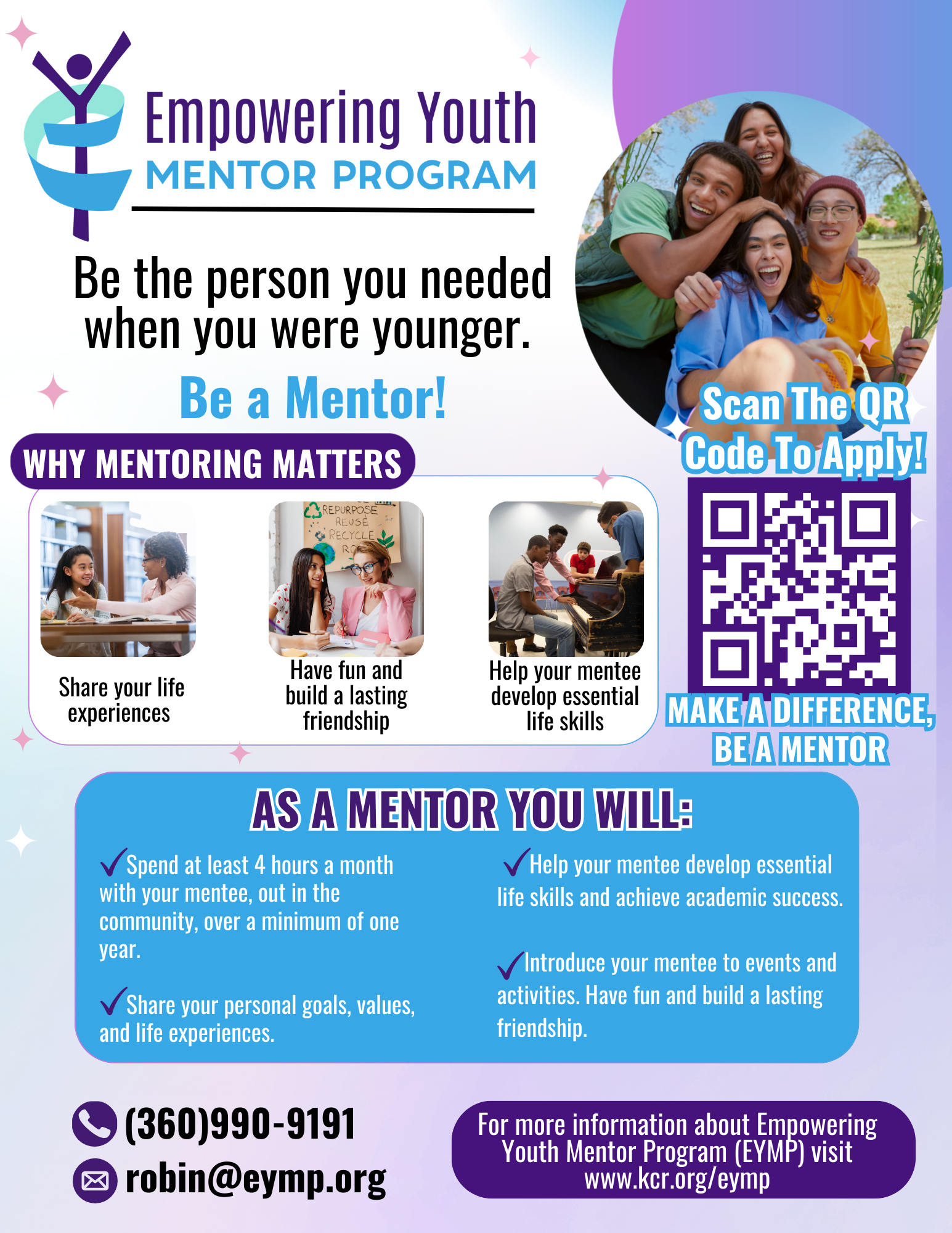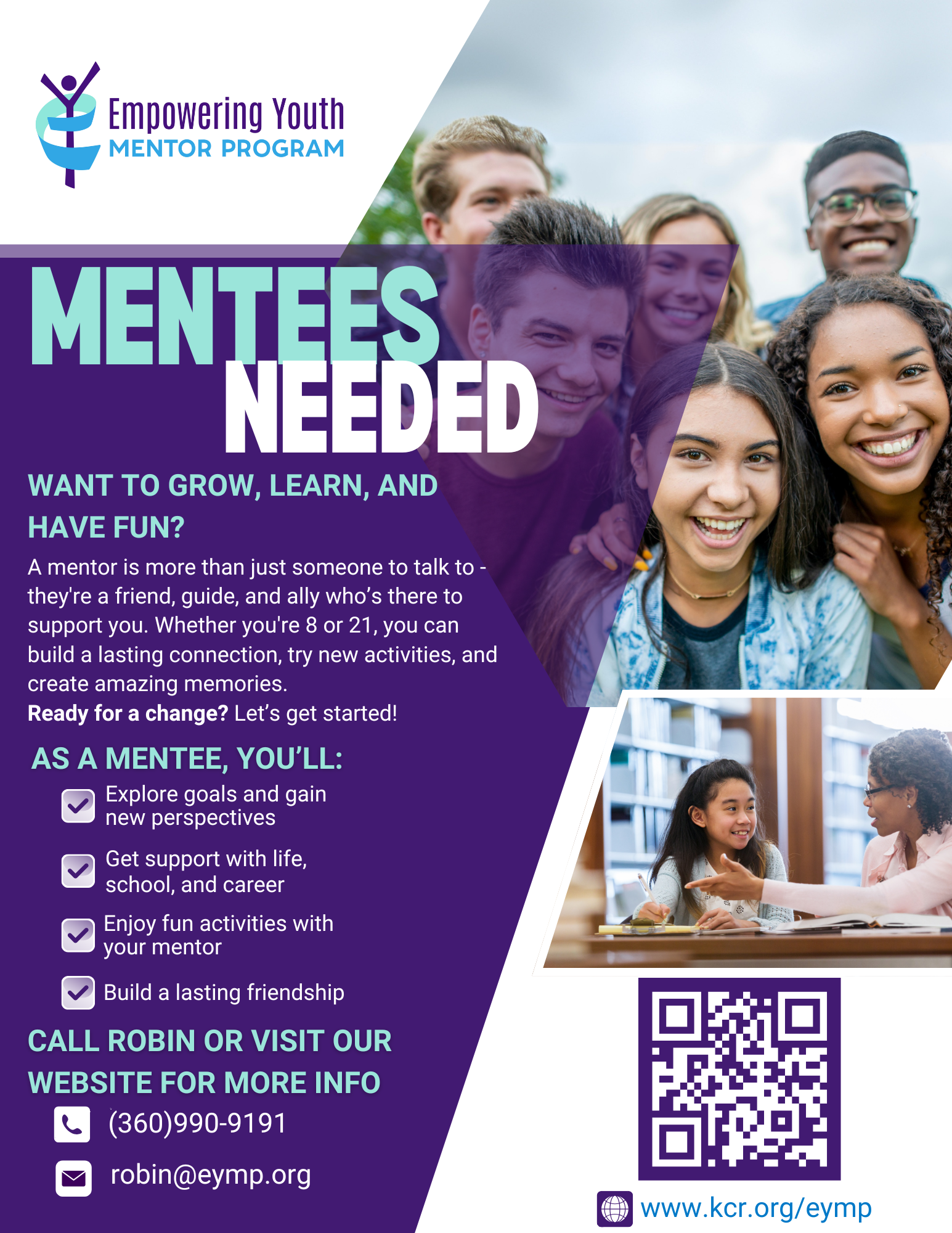 EYMP is a one-to-one, community-based program dedicated to supporting youth aged 8-21 in Kitsap County. The program pairs dedicated volunteer mentors with mentees through thoughtful matching based on shared interests and location. These well-trained mentors serve as positive role models, offering friendship and support to young individuals, many of whom have experienced trauma. Referrals come from professionals in the juvenile justice system, schools, and social services, such as DCYF, but anyone can refer a youth.