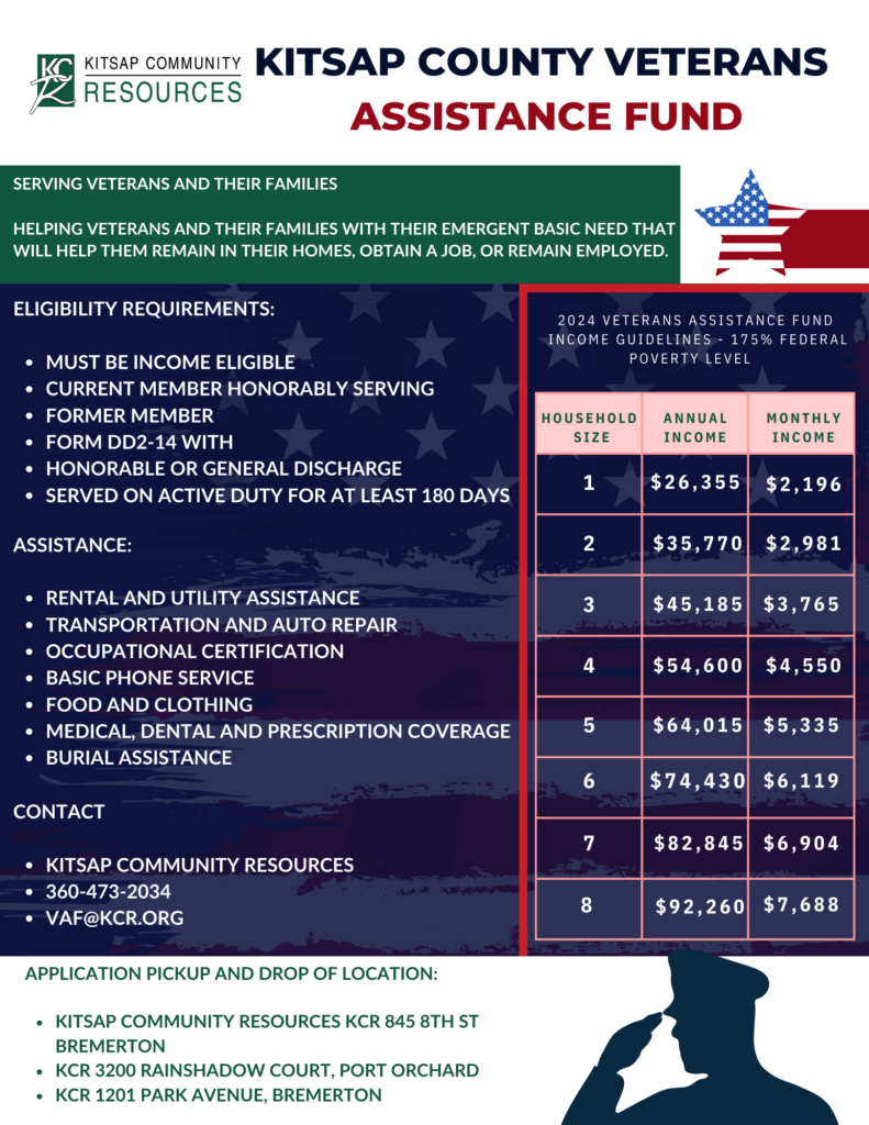 If you are a veteran, Kitsap County and KCR would like you to know that we are proud of you and that we are thankful for your sacrifice in serving our country. In order to extend help to veterans in need, Kitsap Community Resources (KCR) operates the Veterans Assistance Program under contract with the Kitsap County Veterans Program.
