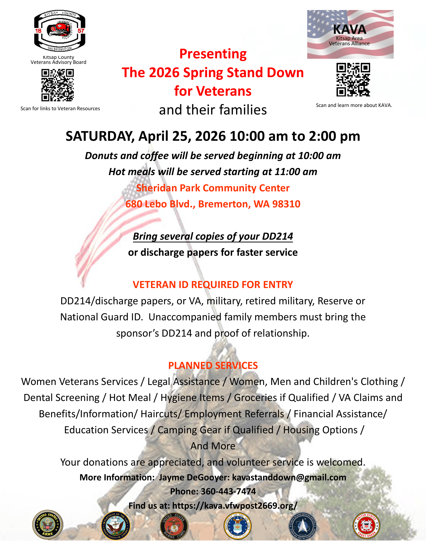 Once your eligibility has been determined by VSO, you may schedule an appointment with program staff at the KCR Veterans Assistance office: (360) 473-2034. They will help you find benefits in veteran as well as non-veteran programs.
